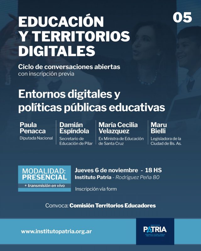El jueves 6 de noviembre a las 18 hs. desarrollaremos la conversación «Entornos digitales y politicas publicas educativas». A partir de la tarea de Imaginar algo nuevo para Transformar lo que ya no sirve a la que nos convoca Cristina Fernández de Kirchner queremos invitarles a que participen de la mesa de cierre del ciclo de charlas. de legisladores y funcionarios nacionales y provinciales que asumen el compromiso de llevar buena parte de las ideas desplegadas al terreno de la legislación y la acción política.