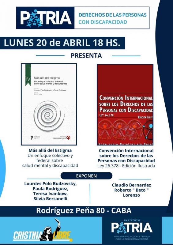 La Comisión de Derechos de las Personas con Discapacidad del Instituto Patria invita a la presentación del libro “Más allá del estigma. Un enfoque colectivo y federal sobre salud mental y discapacidad”, publicado por la editorial Editores del Sur junto a la Revista Pensamiento Penal, y el libro ilustrado sobre la Convención Internacional de los Derechos de las Personas con Discapacidad, una iniciativa de la editorial Locolectivo.
