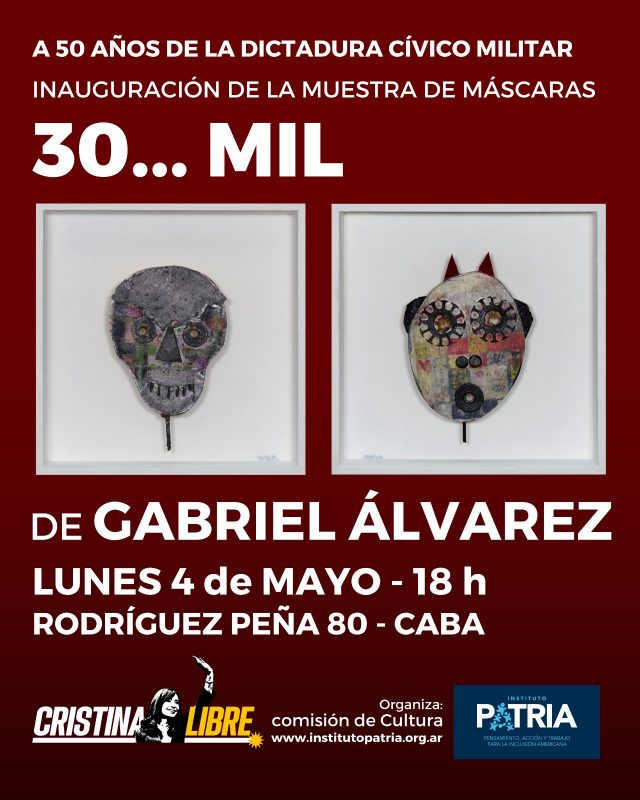 La comisión de Cultura del Instituto Patria tiene el agrado de invitar a la inauguración de la muestra de máscaras 30…mil del artista plástico Gabriel Álvarez, el día lunes 4 de mayo a las 18 hs en la sala Néstor Kirchner del Instituto, sito en Rodríguez Peña 80, CABA.
